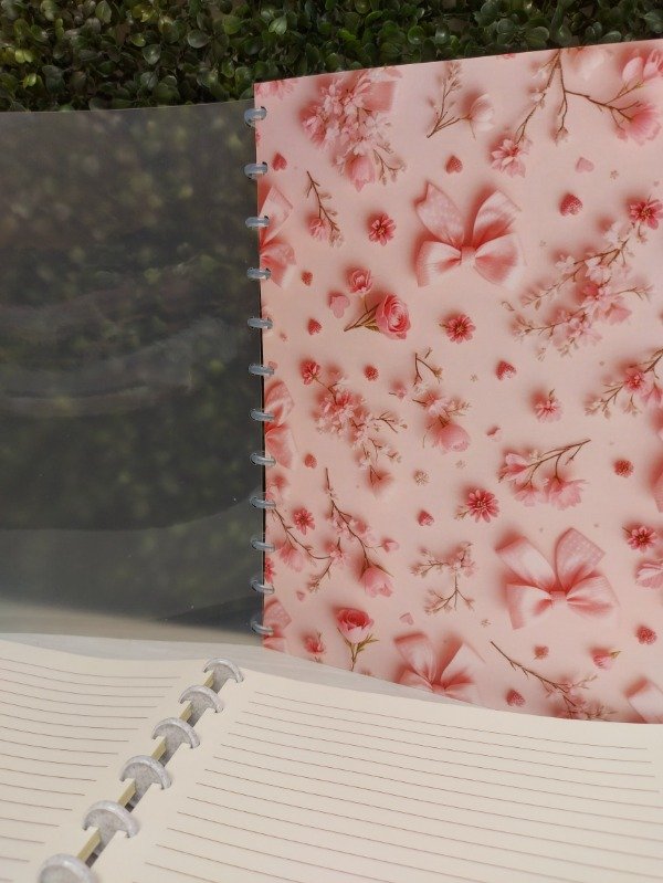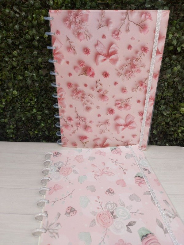 Cuaderno tamaño 20x30cm con tapas de celuloide, cierre de elástico, 100 hojas rayadas, carátula 300gr (a elección) y encuadernación mediante 12 discos de expansión.