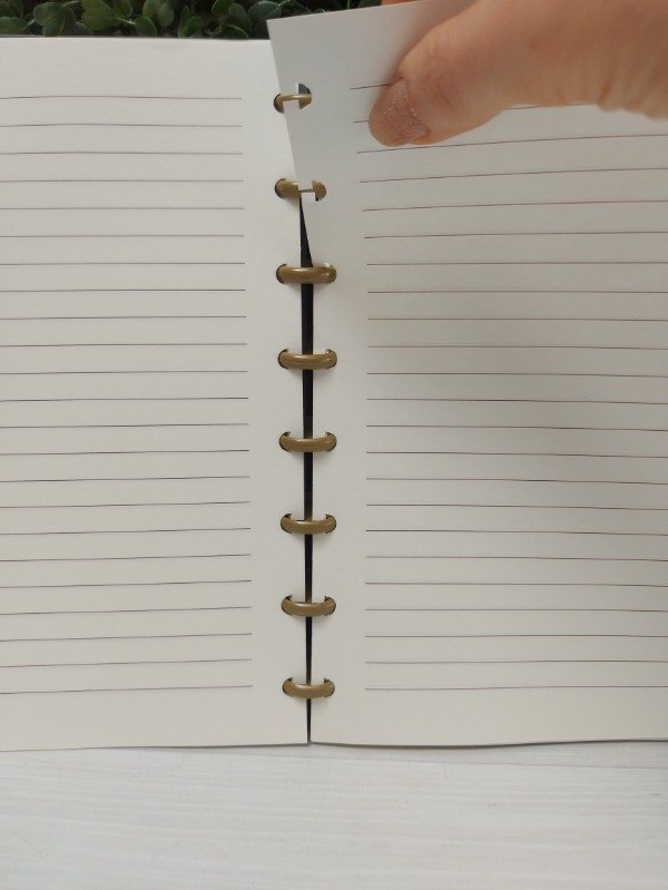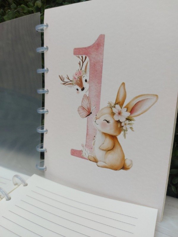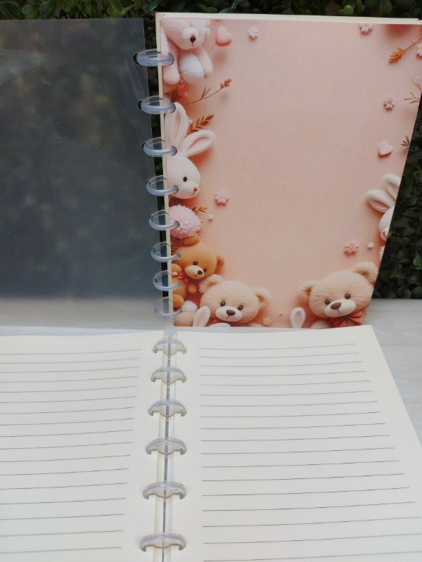 Cuaderno tamaño 15x21cm con tapas de celuloide, cierre de elástico, 100 hojas rayadas ecológicas, carátula 300gr (a elección) y encuadernación mediante 8 discos de expansión. Pueden reemplazarse la totalidad o parte de las hojas rayadas por cartulinas blancas lisas para pegar estampas o recuerdos (consultar adaptación de costo).