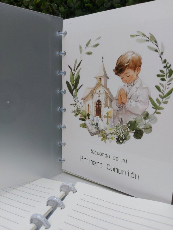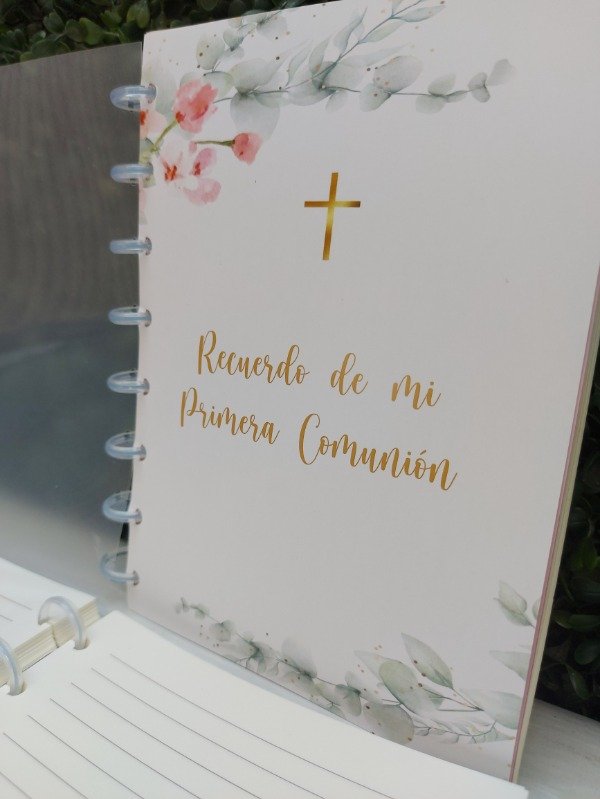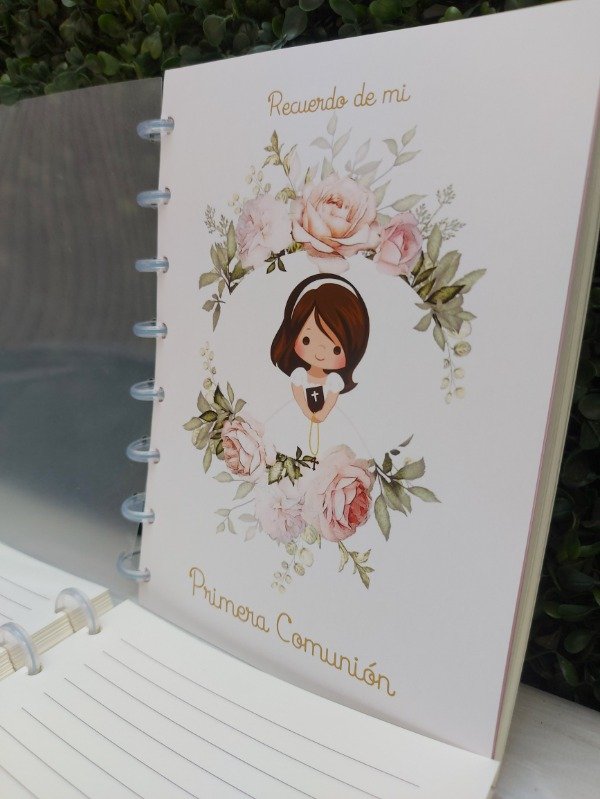 Cuaderno tamaño 15x21cm con tapas plásticas, cierre de elástico, 100 hojas rayadas ecológicas, carátula 300gr (a elección) y encuadernación mediante 8 discos de expansión. Pueden reemplazarse la totalidad o parte de las hojas rayadas por cartulinas blancas lisas para pegar estampas o recuerdos (consultar adaptación de costo).