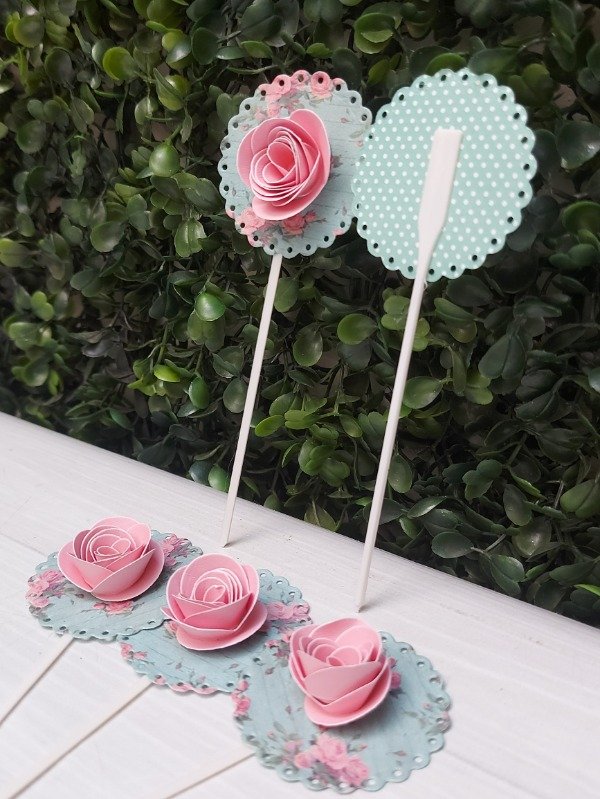 Delicados toppers troquelados en cartulina bifaz con flor 3D. Medida del círculo central: 4cm aprox. Incluyen palito para colocarse en cualquier pieza de pastelería, bocaditos o golosinas. Ideales para decorar desayunos, picadas o mesas de candy. El Paquete contiene 5 toppers iguales.