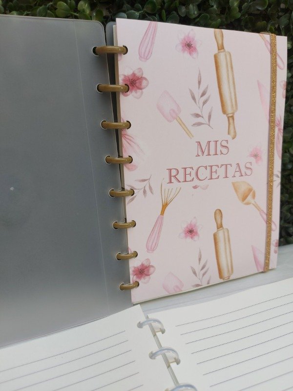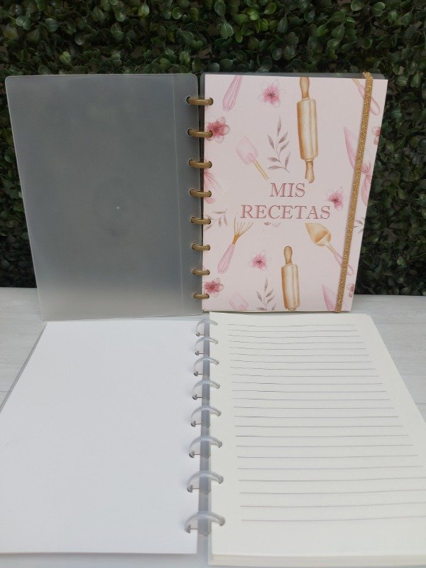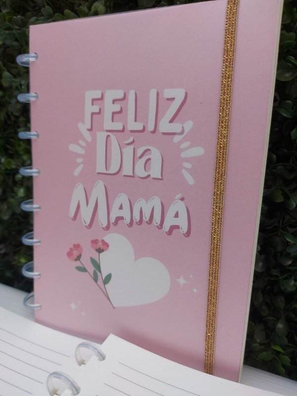 Cuaderno tamaño 15x21cm con tapas plásticas, cierre de elástico, 100 hojas rayadas, carátula FELIZ DIA MAMA o LA MEJOR ABUELA DEL MUNDO 300gr y encuadernación mediante 8 discos de expansión.