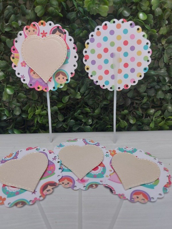 Delicados toppers troquelados en cartulina bifaz con corazón aplicado. Medida del círculo central: 7cm aprox. Incluyen palito para colocarse en cualquier pieza de pastelería, bocaditos o golosinas. Ideales para decorar desayunos, picadas o mesas de candy. El Paquete contiene 5 toppers iguales.